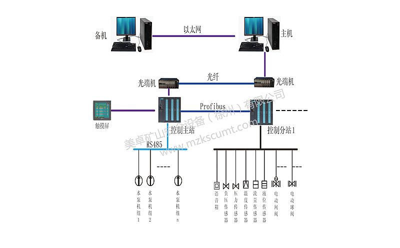 系統水泵房自動化控制系統電動閘閥、防爆電動球閥、現場設備控制箱、模擬量采集傳感器等構成,地面操作站位于調度控制室,所有數據均由以太網或工業總線傳輸至地面控制主機。