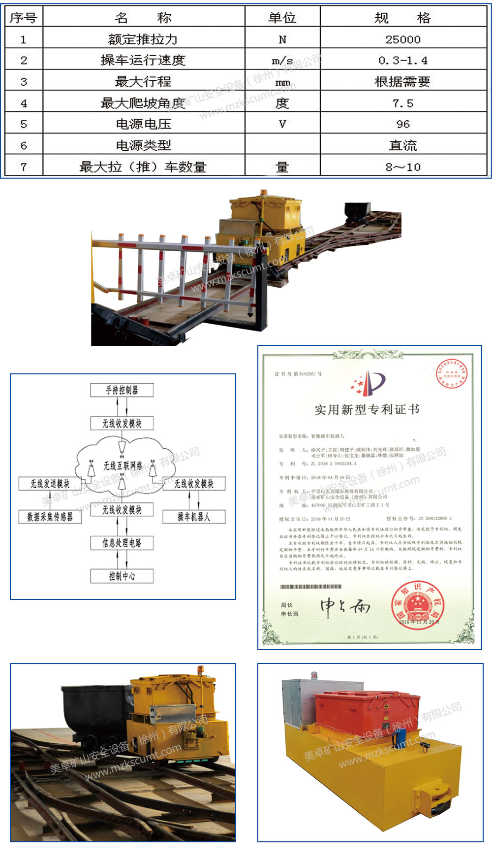 我公司為響應國家煤礦安監局《煤礦機器人重點研發目錄》運輸類第十七條“車場推車機器人”的要求而研發的該機器人,通過無線直接操作,可以滿足機器人直接進罐推拉車、彎道推拉車、車場調車等功能。該推拉車機器人對車場長度要求低,不需要額外做推車機基礎,能夠在彎道上使用,能夠在一個水平開采完畢后轉移到另外一個水平繼續使用,不需要經常更換