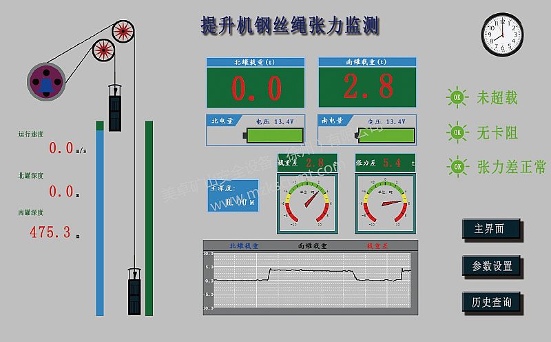 3、容器正常運行后,通過行程定位、數據采集、智能判斷,可及時準確判斷容器在井筒中任何位置狀況(包括容器位置、井筒卡阻、防墜器誤動作、松繩等問題)。