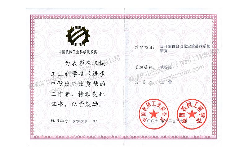 中國機械工業科學技術將二等獎