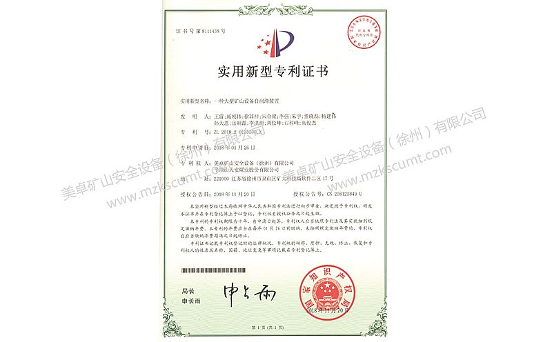 礦山設備自動潤滑裝置專利證書